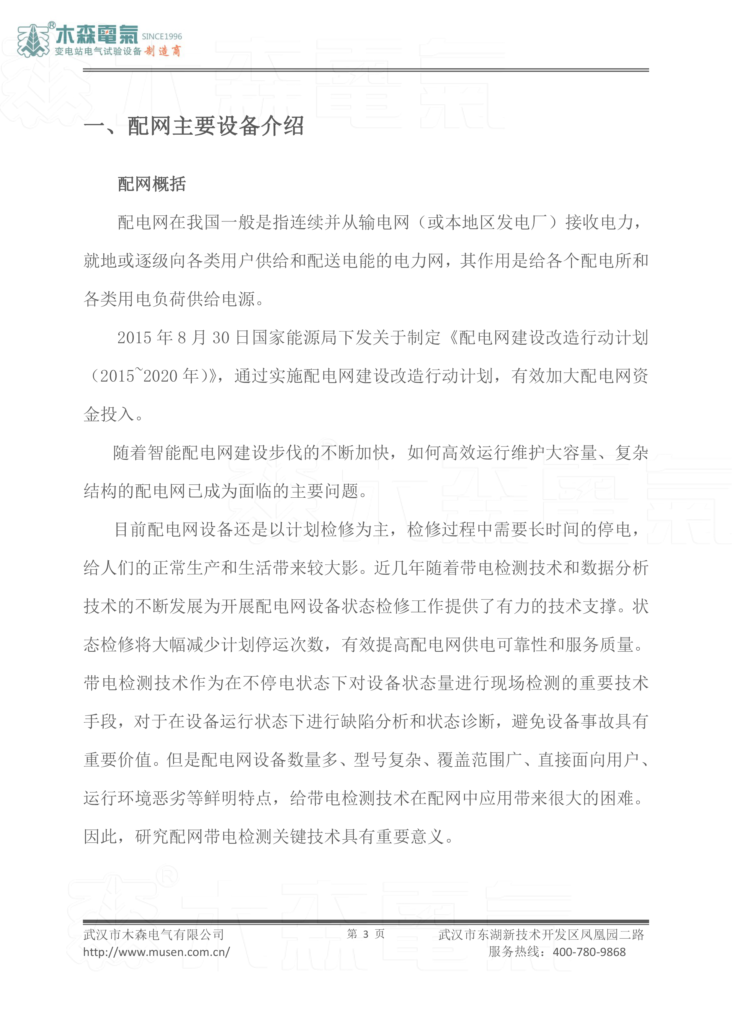 - 一、配網(wǎng)主要設(shè)備介紹配網(wǎng)概括配電網(wǎng)在我國(guó)一般是指連續(xù)并從輸電網(wǎng)(或本地區(qū)發(fā)電廠)接收電力,就地或逐級(jí)向各類用戶供給和配送電能的電力網(wǎng),其作用是給各個(gè)配電所和各類用電負(fù)荷供給電源。2015 年 8 月 30 日國(guó)家能源局下發(fā)關(guān)于制定《配電網(wǎng)建設(shè)改造行動(dòng)計(jì)劃(2015~2020 年)》,通過(guò)實(shí)施配電網(wǎng)建設(shè)改造行動(dòng)計(jì)劃,有效加大配電網(wǎng)資金投入。隨著智能配電網(wǎng)建設(shè)步伐的不斷加快,如何高效運(yùn)行維護(hù)大容量、復(fù)雜結(jié)構(gòu)的配電網(wǎng)已成為面臨的主要問(wèn)題。目前配電網(wǎng)設(shè)備還是以計(jì)劃?rùn)z修為主,檢修過(guò)程中需要長(zhǎng)時(shí)間的停電,給人們的正常生產(chǎn)和生活帶來(lái)較大影。近幾年隨著帶電檢測(cè)技術(shù)和數(shù)據(jù)分析技術(shù)的不斷發(fā)展為開展配電網(wǎng)設(shè)備狀態(tài)檢修工作提供了有力的技術(shù)支撐。狀態(tài)檢修將大幅減少計(jì)劃停運(yùn)次數(shù),有效提高配電網(wǎng)供電可靠性和服務(wù)質(zhì)量。帶電檢測(cè)技術(shù)作為在不停電狀態(tài)下對(duì)設(shè)備狀態(tài)量進(jìn)行現(xiàn)場(chǎng)檢測(cè)的重要技術(shù)手段,對(duì)于在設(shè)備運(yùn)行狀態(tài)下進(jìn)行缺陷分析和狀態(tài)診斷,避免設(shè)備事故具有重要價(jià)值。但是配電網(wǎng)設(shè)備數(shù)量多、型號(hào)復(fù)雜、覆蓋范圍廣、直接面向用戶、運(yùn)行環(huán)境惡劣等鮮明特點(diǎn),給帶電檢測(cè)技術(shù)在配網(wǎng)中應(yīng)用帶來(lái)很大的困難。因此,研究配網(wǎng)帶電檢測(cè)關(guān)鍵技術(shù)具有重要意義。