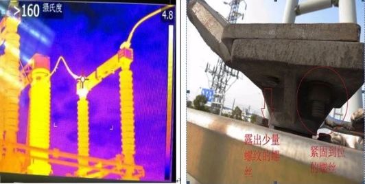 原因分析:110kV某開關(guān)隔離開關(guān)C相靠斷路器側(cè)的設(shè)備線夾,4個(gè)螺絲中只有一個(gè)有螺帽,另外3個(gè)螺絲僅僅超出接線端子板平面幾圈螺紋長度,螺帽無法有效緊固,在運(yùn)行期間,因隔離開關(guān)分合閘帶來的機(jī)械應(yīng)力,導(dǎo)致螺帽逐漸松脫掉落,4個(gè)螺絲壓力不均,導(dǎo)致接觸面產(chǎn)生很大的接觸電阻,引起發(fā)熱。。