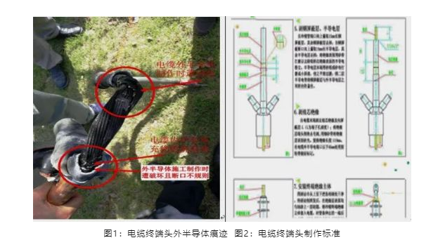 原因分析:施工單位在進(jìn)行10kV全冷縮三芯交聯(lián)電纜終端頭制作時(shí),未按照“自銅屏蔽斷口向上量取15mm 長(zhǎng)半導(dǎo)電層其余半導(dǎo)電層去掉”的工藝規(guī)范要求施工,而是至電纜銅屏蔽斷口處全部去掉,導(dǎo)致電場(chǎng)分布非常不均勻,應(yīng)力過(guò)度集中在外半導(dǎo)體層斷口處,致使絕緣層與護(hù)套之間產(chǎn)生局部放電致使電纜燒損。。