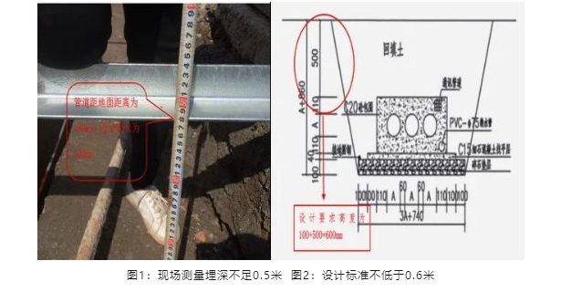 原因分析:10kV線(xiàn)路新建電纜埋深不足,管道距地面距離為480mm,設(shè)計(jì)要求為600mm,尺寸嚴(yán)重不足,不符合電力建設(shè)土建通圖圖號(hào)通-GD-01-04-01(電力管道預(yù)埋及電纜溝施工通圖分冊(cè))技術(shù)規(guī)范要求,業(yè)主及監(jiān)理單位未及時(shí)發(fā)現(xiàn)存在的問(wèn)題,建設(shè)過(guò)程管理缺乏有效監(jiān)督。