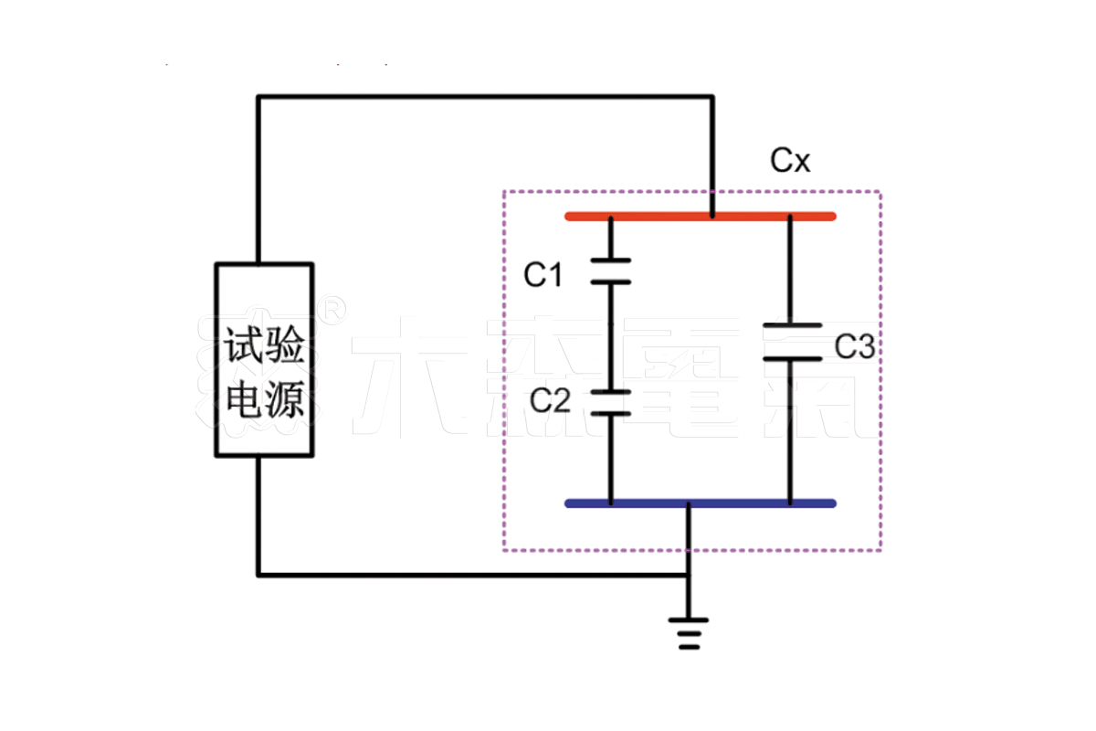 《GB 50150-2006 電氣裝置安裝工程電氣設(shè)備交接試驗(yàn)標(biāo)準(zhǔn)》要求新竣工的電纜需要進(jìn)行耐壓試驗(yàn),高壓電纜交流耐壓等效電路如下圖,用C1、C2、C3組合模擬被試電纜的各個(gè)絕緣部件,在試驗(yàn)過程中C1、C2、C3同時(shí)承受高電壓的考驗(yàn)。