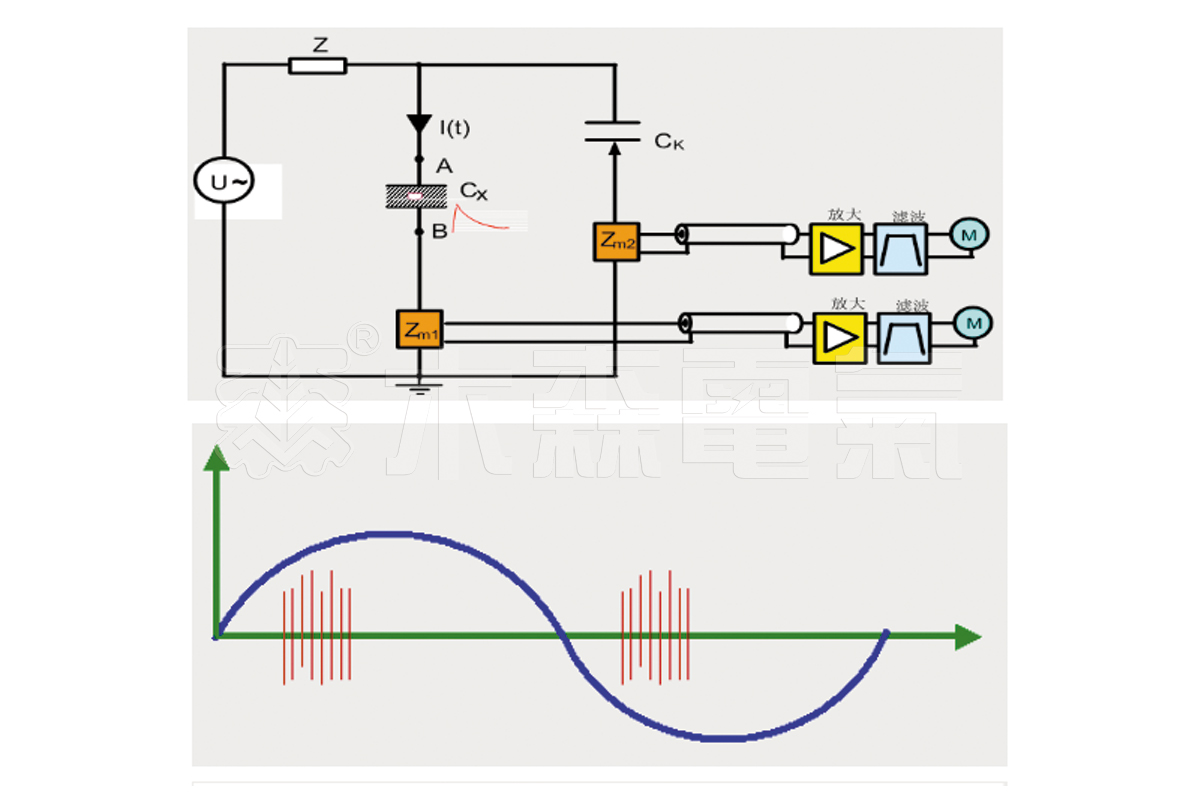 在電纜耐壓試驗(yàn)過程中,采用如下測試回路,就可利用脈沖電流法監(jiān)測電纜局部放電情況,測試原理如下圖。Cx為被試驗(yàn)電纜,Ck為耦合電容器,在Cx、Ck的端部分別接入檢測阻抗Zm1、Zm2。Z為高頻阻波器,抑制電源中的干擾信號(hào)進(jìn)入局放測試回路,阻止局放信號(hào)進(jìn)入電源系統(tǒng)。