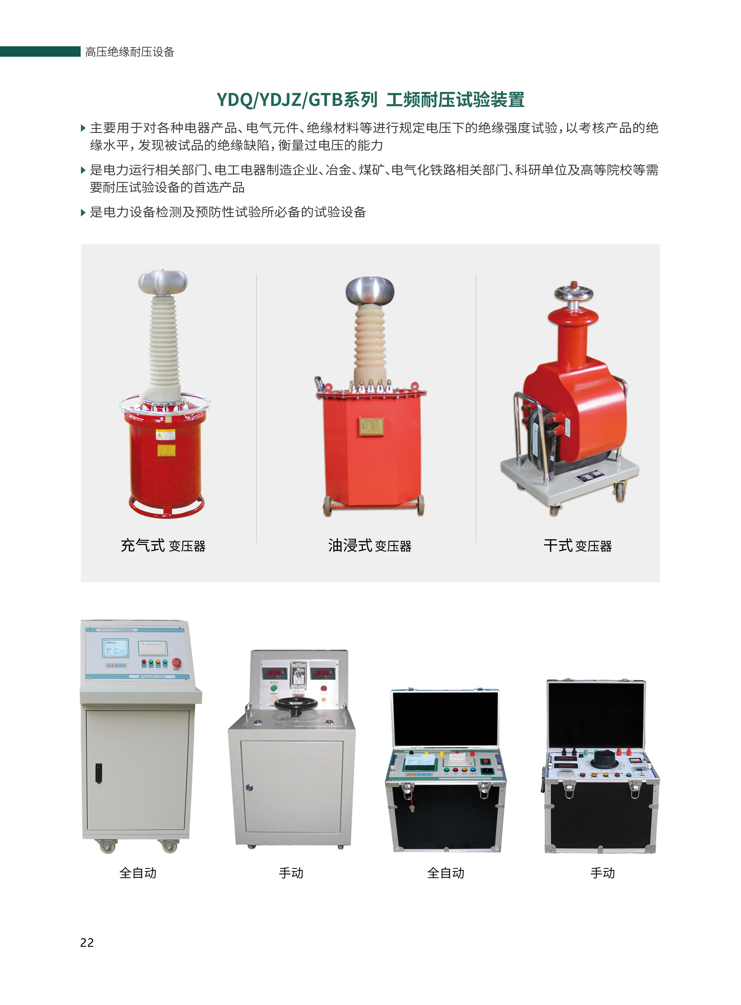 YDQ/YDJZ/GTB系列工頻耐壓試驗(yàn)裝置:適用范圍主要用于對(duì)各種電器產(chǎn)品、電氣元件、絕緣材料等進(jìn)行規(guī)定電壓下的絕緣強(qiáng)度試驗(yàn),以考核產(chǎn)品的絕緣水平,發(fā)現(xiàn)被試品的絕緣缺陷,衡量過電壓的能力。是電力運(yùn)行相關(guān)部門、電工電器制造企、冶金、煤礦、電氣化鐵路相關(guān)部門、科研單位及高等院校等需 要耐壓試驗(yàn)設(shè)備的首選產(chǎn)品